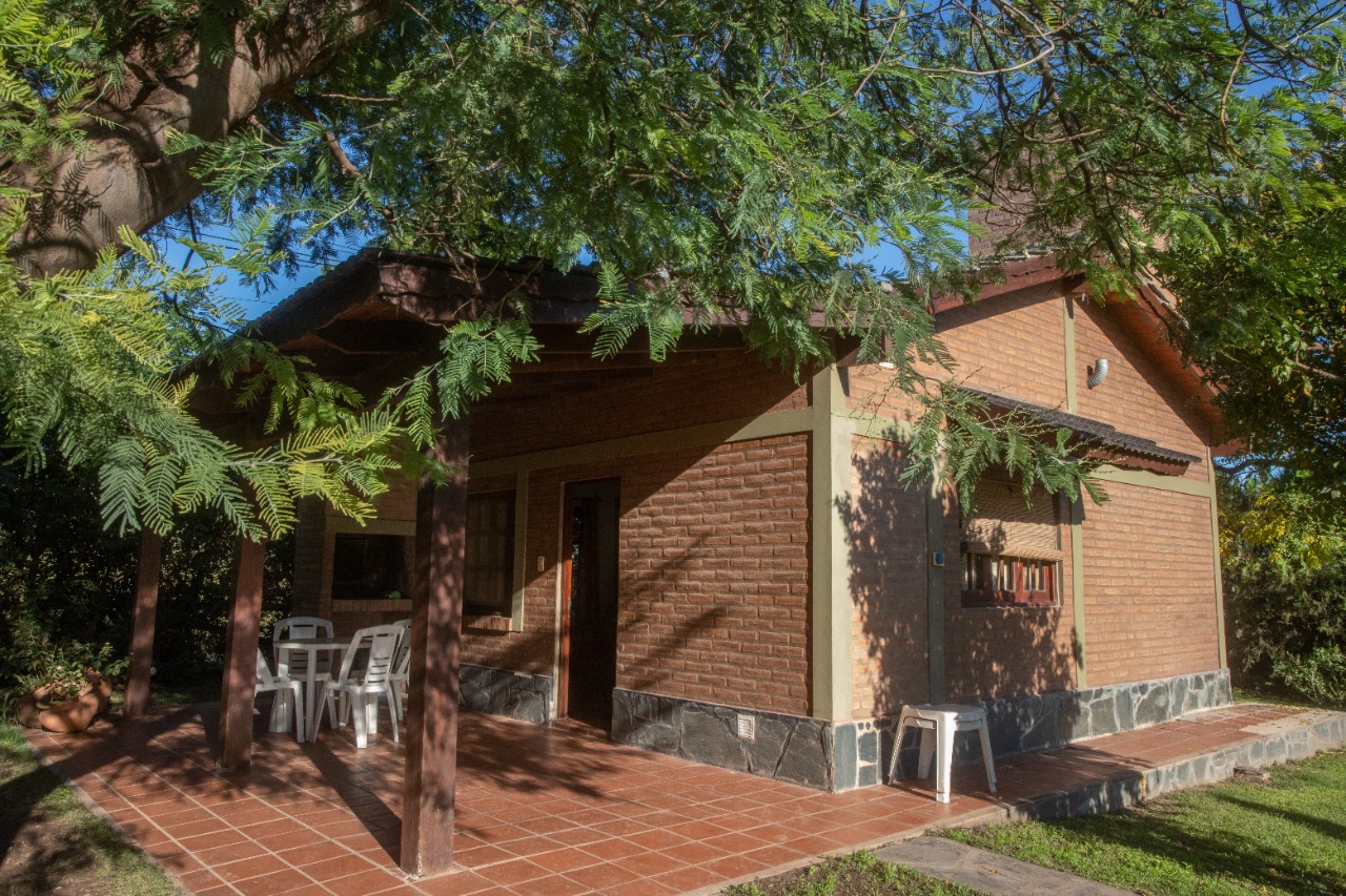 Cabaña Clásica toda en planta baja. Ladrillos vista, Tiranteria de Quebracho, Aberturas y mobiliario de Algarrobo, Artesanías con decoración country.